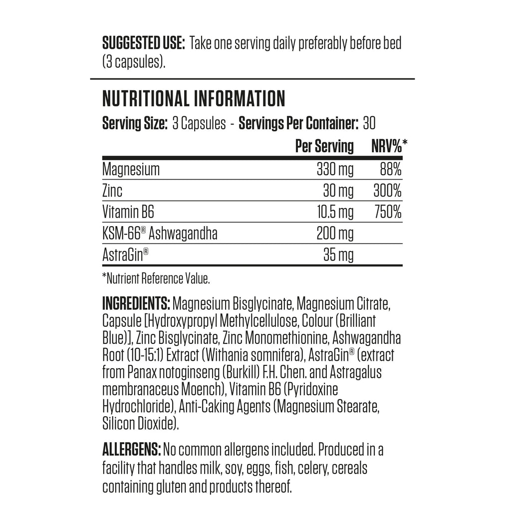 - المكونات الرئيسية : يعمل الزنك والمغنيسيوم وفيتامين ب6 والأشواغاندا معًا لدعم التعافي والنوم والأداء النهاري.